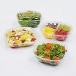 VG PET Tamper Evident Square Bowls are perfect for leaf or pasta salads, cut vegetables, cut fruit, nuts, candies and other specialty foods.. Available in 5” (Small), 7.5” (Medium) and 9” (Large) convenient diameters. These square bowl options are stackable and increase the shelf space efficiency by 25% over round bowls. Crystal clear lids give the consumer a clear view before buying and they are also crack-resistant and spill-proof to ensure safe and stable handling. Black bases available in custom option.